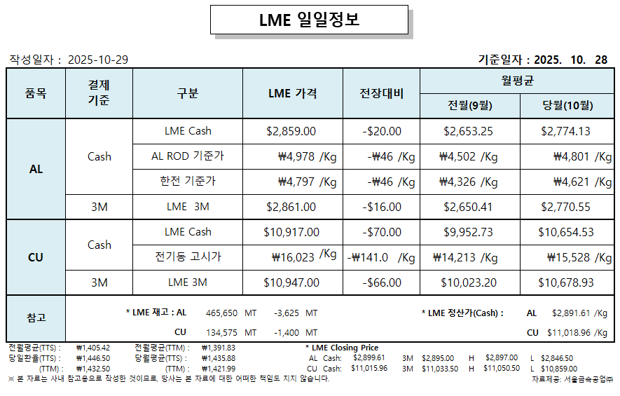 LME 일일 정보 2025-10-29