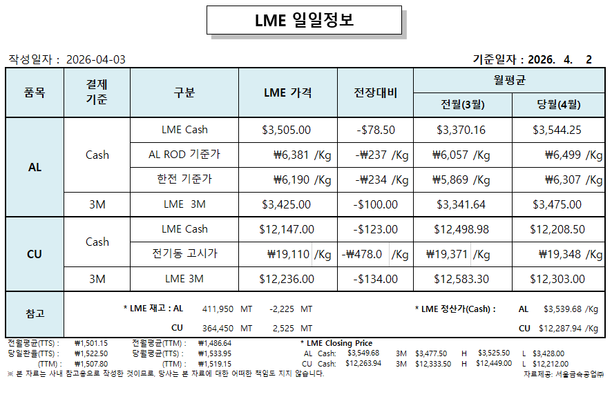 LME 일일 정보 2026-04-02