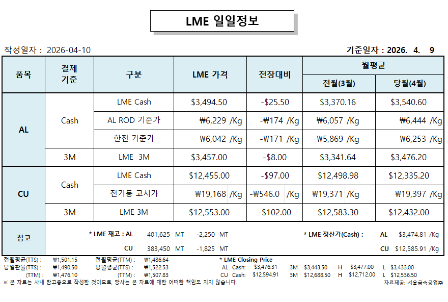 LME 일일 정보 2026-04-09